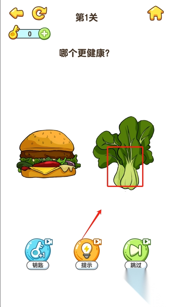 1、在第1关界面,点击右侧的绿色蔬菜图标,选择健康的食物选项。