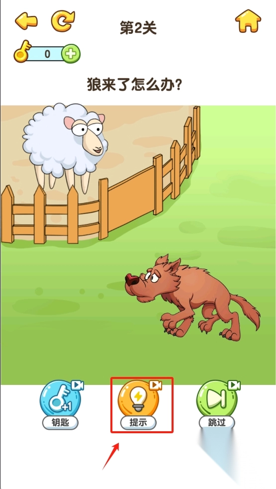2、在第2关界面,点击中间的“提示”按钮,获取解决问题的线索。