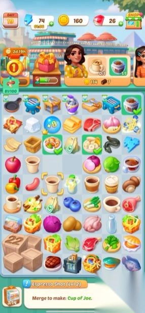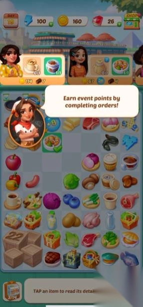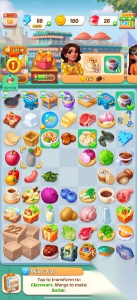 1. 只需拖动两个一样的食材,就能合并成为更高级别的食材。