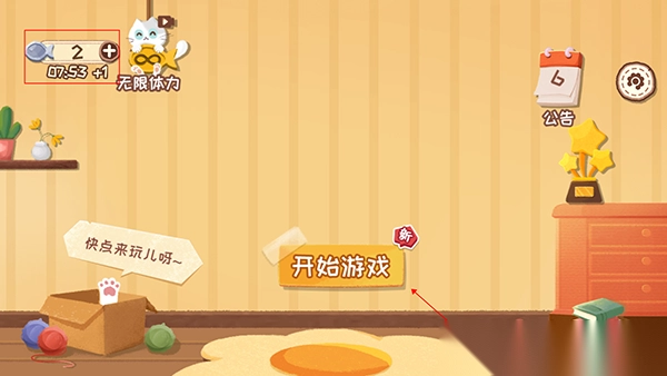 1. 当玩家进入游戏主页,便能在左上角看到自己剩余的体力数值。点击“开始游戏”按钮,即可开启收纳之旅。
