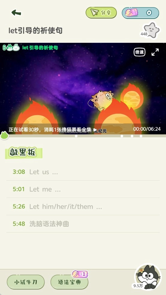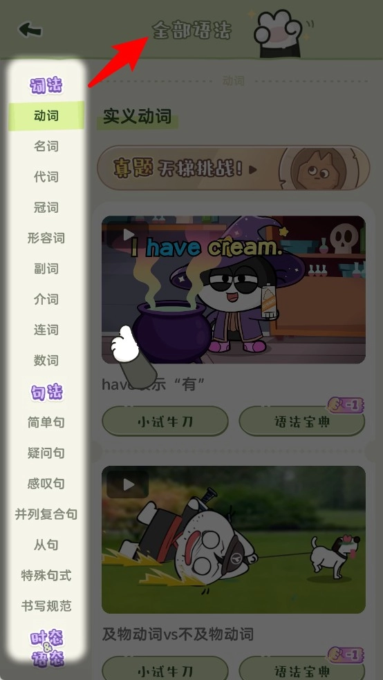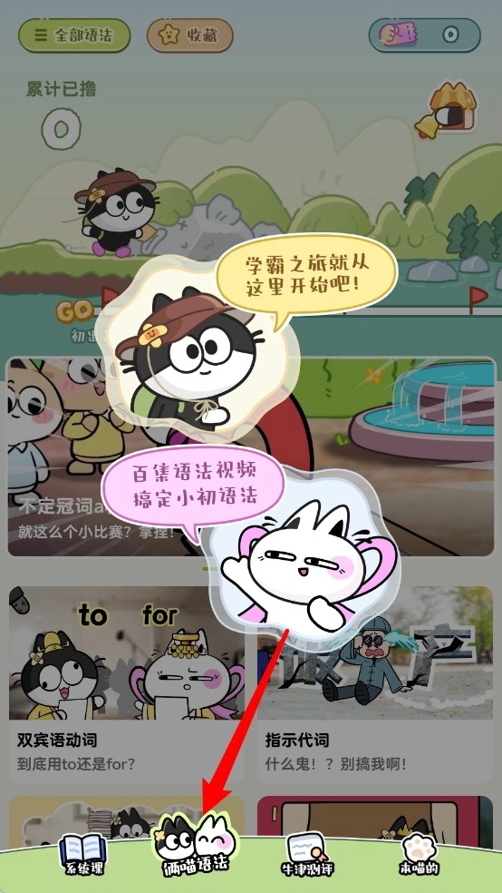 1、点击底部“俩喵语法”图标,进入语法学习的卡通互动专区。