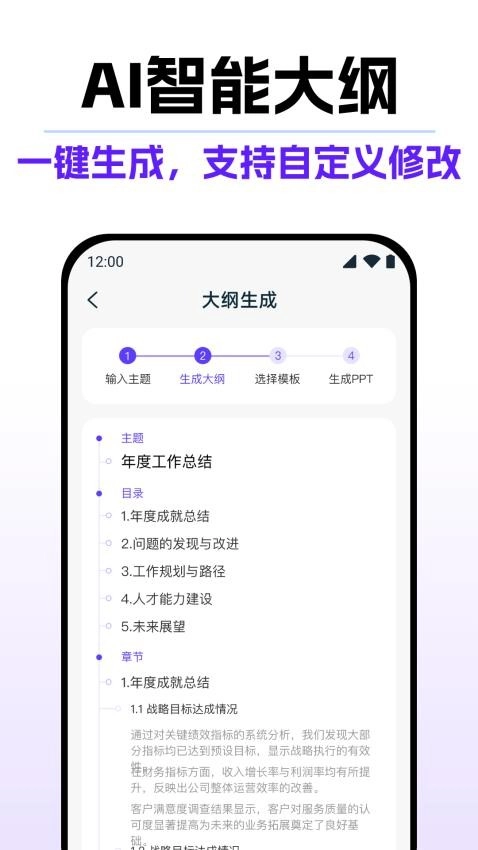 2、AI智能构建大纲功能,并支持用户灵活调整大纲细节,便于按需优化PPT框架。