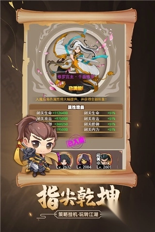 2、江湖Q版风格来袭!其情节扣人心弦,江湖中的Q版角色萌态十足,却又不失热血豪情。刀光剑影的江湖氛围,能让玩家瞬间沉浸其中,代入角色。在游戏剧情里,玩家所做的每一个选择,都全然出自内心,无论是展现英雄气概,还是施展枭雄的战略,皆由玩家自主决定。