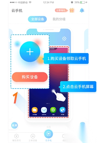 1. 开启蓝光云手机的最新版本,轻点“购买设备”选项,获取一部属于自己的云手机。