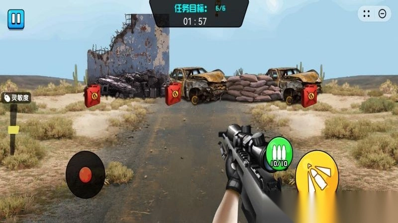 1、在沙漠、室内等场景,操控枪械射击目标,完成任务挑战。