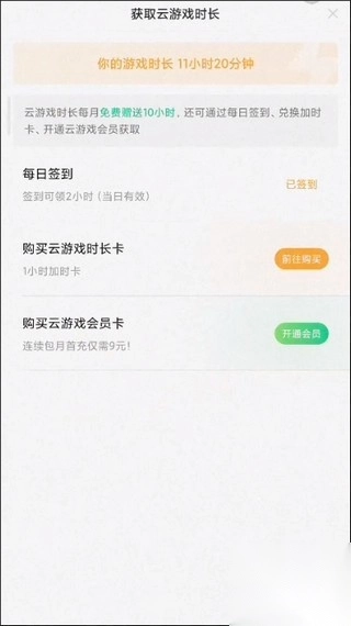 3、签到要退出来,在app里面点击获取云游戏时长签到。