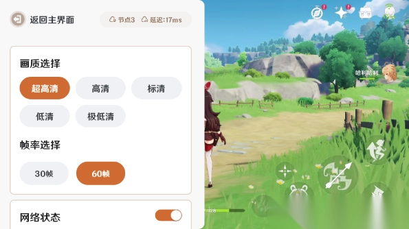 打开云原神信息界面即可选择画质,一般选超高清,60帧即可享受堪比顶级电脑运行的原神画质。