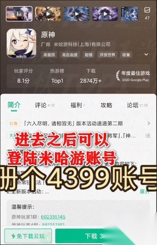 1、下载4399游戏盒,找到原神点击免下载云玩,需要注册一个4399账号然后就可以进米哈游的登陆界面。