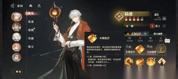 周瑜凭借天赋【国士风采】以及缘分【大都督】,能对全队的灼烧伤害实现双重提升。陆逊的天赋【火烧连营】可复制目标身上的灼烧层数,加速灼烧状态的传播扩散。在此基础上,配合周瑜的突破大招【赤壁灾炎爆】,能够瞬间引爆所有灼烧效果,进而爆发高额伤害。