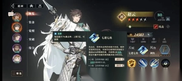 2. 建队思路围绕赵云的五虎上将缘分展开,赋予赵云防御穿透以及无视护盾的能力。同时,集齐4蜀激活阵营光环,强化增伤与减伤效果。借助【将军】邀战和赵云的【龙胆】产生联动,首回合叠加【龙胆】暴击加成,到第二回合赵云就能释放出高伤害的大招。而且赵云每次攻击都能触发七进七出的额外攻击,极大提升输出效率。张飞依靠先手大招搭配风物推条,能有效降低敌方全体的时序和伤害。关羽担当补刀手,负责收割残血敌人,他转职为【收割者】后,击杀敌人时可触发再动,达成连续攻击。孙权、刘备、曹昂转职为【将军】,凭借邀战机制提高赵云的攻击频率。孙权每两回合为全队拉条,加快攻击速度;曹昂每两回合为全队增伤,进一步增强团队的输出能力。