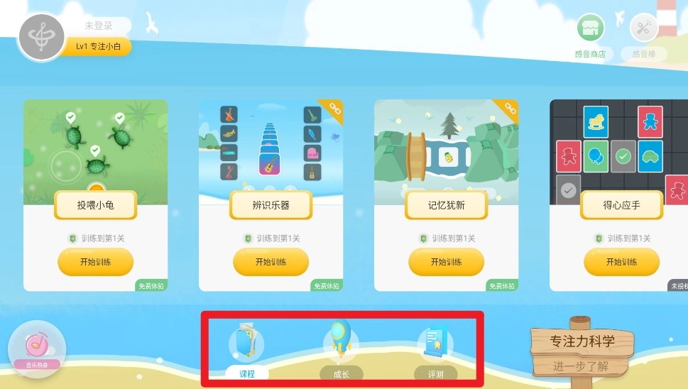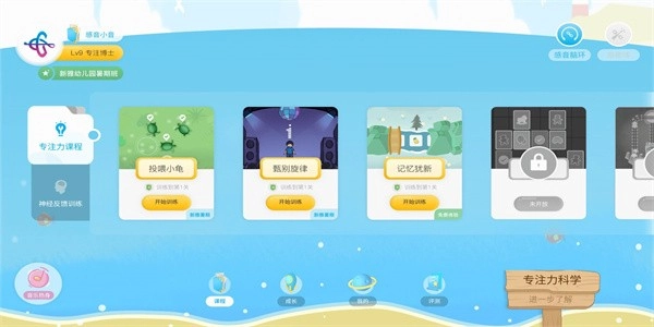 2.进入主界面可选择不同训练项目,如投喂小龟、拼识乐器等。