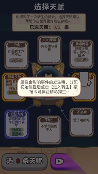 4、每次重生前,系统会随机抽取若干个天赋,如“乖巧”、“爱翻垃圾桶”、“速度飞快”、“抗压强”等,玩家需从中选出三项最契合的组合。