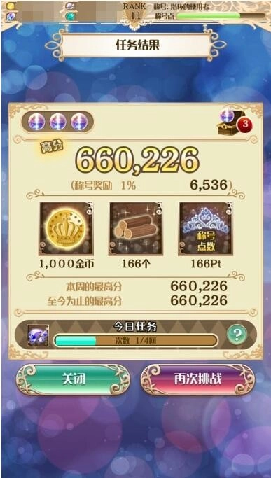 3、选择好后即可进入挑战,挑战成功可获得积分奖励、金币和称号点数等奖励
