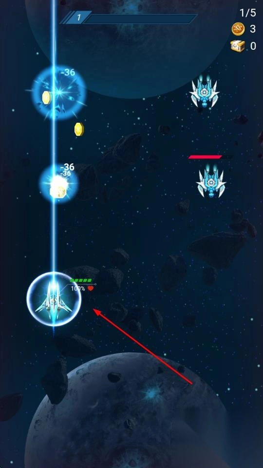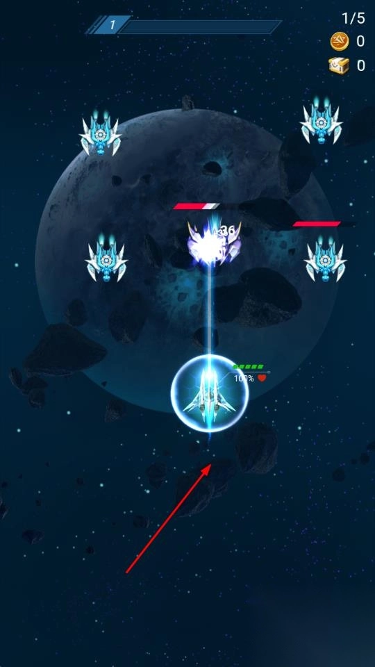1. 进入游戏,来到战机选择页面,挑选自己喜欢的战机。随后,通过滑动屏幕,操控战机在初始的太空场景里移动,当遇到迎面而来的敌人时,点击射击按钮向其发动攻击。