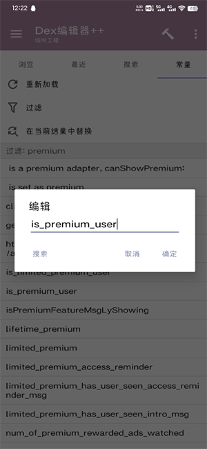 解锁的版本是3.3.16,附加的挑个简单的来。打开dex文件,全选,dex++,常量过滤premium,选择is_premium_user进行搜索。