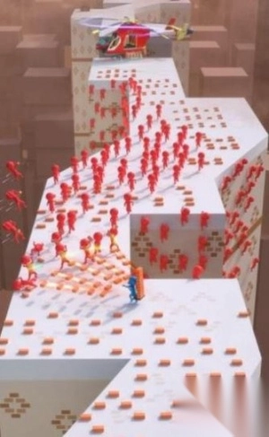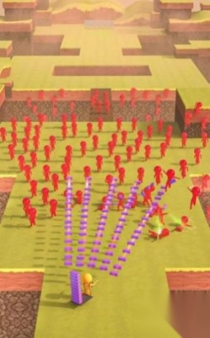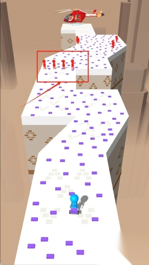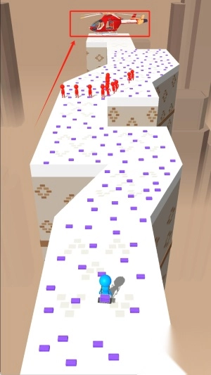 1、操控蓝色角色在白色平台上前进,注意避开紫色方块障碍,同时观察上方红色人群的移动规律。