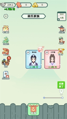 1、角色婚配:家族里适龄成员到了婚配年纪时,你能于游戏内的媒妁系统,或者在社交场景之中,为其寻觅合适的伴侣。挑选时,优先考量对方家族的实力、成员的品行以及健康状况等要素。举例来说,和名门望族联姻,能够提高家族的声望,给家族带来更多的资源与发展机遇;而选择品行端正、身体健康的伴侣,对后代良好基因的传承有益。