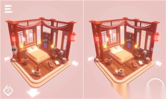 【玩法】在“对比区别”画面中,两侧为房间场景。你可以运用“放大缩小移动观察视角”的操作,以及点击房间周边的“箭头”来改变观察中心视角,以此寻找不同的物体。当成功找出所有不同物体后,便能通关当前关卡。