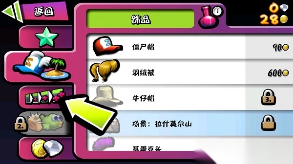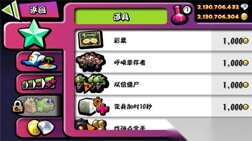 商店:游戏结束后会出现一个界面,界面上有许多格子。当格子被脑子填满时,系统会赠送一张刮刮卡。刮开刮刮卡,可能获得道具、装饰或者钱。钱能够用于升级道具(即上文中提到的那些道具),也能用来升级技能x,比如开场出现两个僵尸,僵尸走两步就送你四个人头x 。当然,钱还能用来购买装饰,只是装饰是每一局随机分配的,没办法呀。