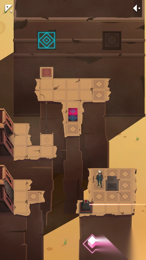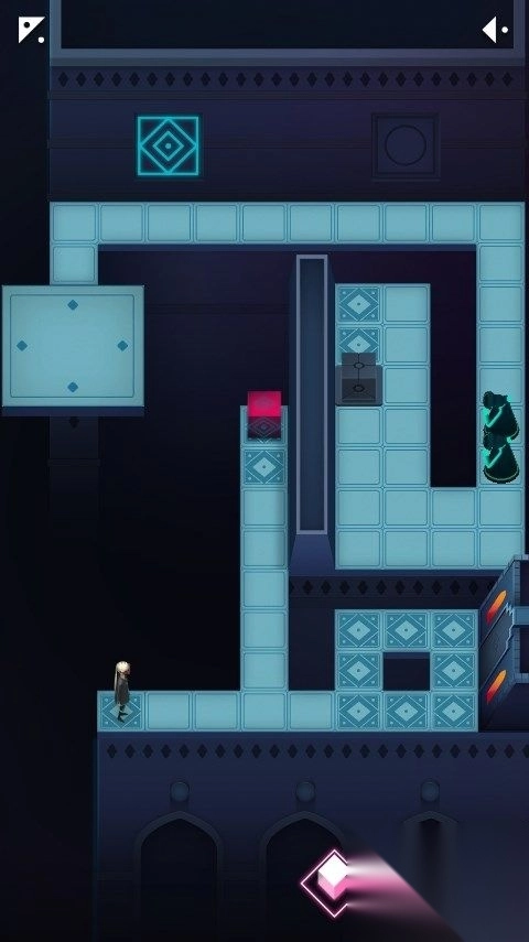 2、在此处,你得设法把那个箱子推到红色方块里。当行至某个位置,右下角出现发光按钮时,点击右下角的菱形按钮,你就会被传送到另一个空间。