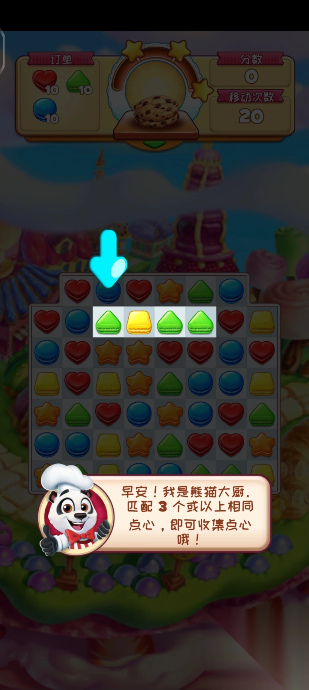 收集特定数量的甜点:比如需要消除20个蓝色马卡龙和15个红色蛋糕。