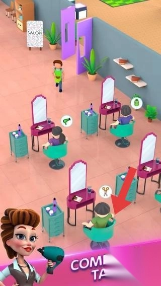 1. 展现理发店的经营情景,场景中有顾客和员工。玩家在此场景中扮演理发店经营者,能够开展与沙龙经营相关的各类操作,像为客户提供服务、对店铺进行改造等,借助策略化管理来提高店铺收益。
