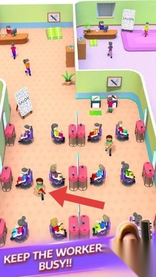 3、展现沙龙的经营场景,场景中包含顾客与员工。通过文字提示,要求员工始终处于忙碌状态,玩家要合理调配员工,为顾客提供服务,进而实现对沙龙的有效管理。