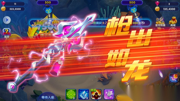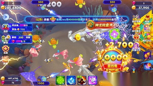 5、在捕捉鱼时,炮台不要盲目射击猎捕,要注意观察得分高的鱼类进行捕杀,不然很容易把子弹浪费掉或用完的。
