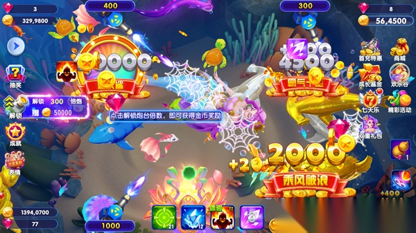 3、你在激烈的捕鱼中,还要时常注意屏幕左右两侧的奖增项提示,要随时注意点开了,这样可以得到更多的金币。