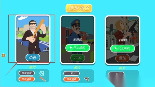 1、在角色选择界面,点击红框选中的"杰克"角色,查看其"缓慢时间"特殊能力说明,注意下方两个未解锁的特殊道具栏位提示后续可解锁内容。