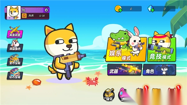 1. 进入游戏后,我们能够看到包含娱乐模式、竞技模式、武器、角色等的功能栏。