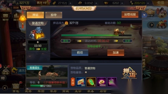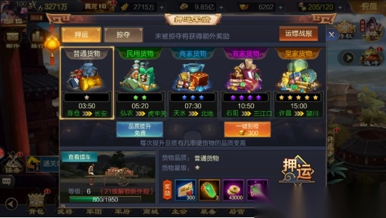 每天有1次免费提升品质的机会,每次提升品质有几率使货物的品质变高,但也有可能不变,花费少量元宝可以一键提升至最高品质,每日有4次押运次数,可购买额外押运次数。