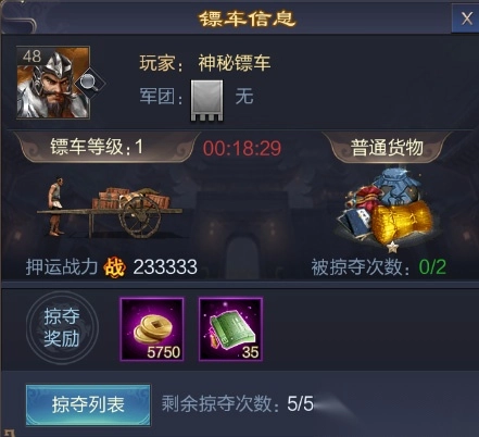 玩家可以掠夺其他玩家货物,若镖车未被成功掠夺,则运送结束时将获得额外奖励。每辆镖车可以被掠夺2次,每个玩家每日总共可以掠夺5次,可额外购买掠夺次数。