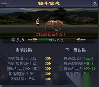 押运获得的镖车经验可以提升镖车等级,镖车升级可以增加属性和奖励,达到指定等级可以解锁新外观。