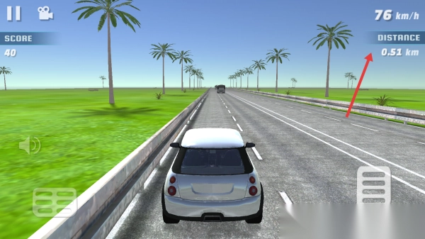 2、在公路行驶时,控赛车方向避其他车辆,关注右上角“DISTANCE”(距离)与“km/h”(速度),保持高速,借单向车道优势超车,积累分数。