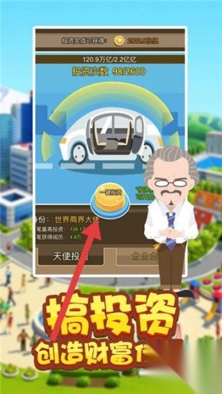 3、进入“搞投资”模块,点击投资按钮(红箭头指向),选择项目,创造财富传奇,提升收益。