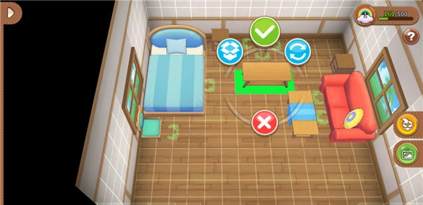 进入屋子后,点击右上方的“装潢”即可进入布置模式。此时,长按某一家具1.5秒,就能对其进行移动、旋转、收纳整理以及放置操作。每件家具都有占地面积,只能摆放在显示为绿色的区域。而且,如同椅子、沙发这类可坐的家具一样,还需充分考虑人物的落脚点。在摆放家具时,如果发现家具底部明明呈绿色状态却无法放置,这就意味着该家具本身或其周围的家具没有足够空间供角色进行交互,需微调至出现绿色足迹,才能顺利放置。