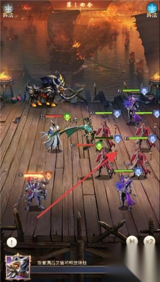 3、战斗第1回合,选红色箭头指向武将,释放技能(如“世墨澜启动强制冲锋技能”),配合阵法,集火敌方,赢回合制对战。