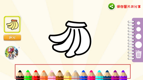 3、选取底部彩色铅笔,为中间香蕉轮廓图案进行涂色创作。