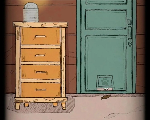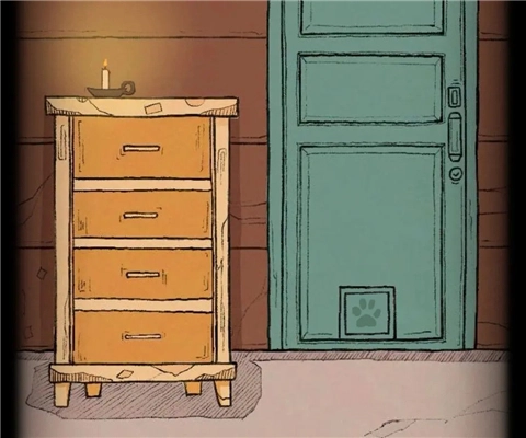 打开烛台下柜子第四格得到小鱼干,将小鱼干放在门下方的小洞口处,会有一只小猫拿走并给到柜子第二格钥匙,打开得到旋钮。
