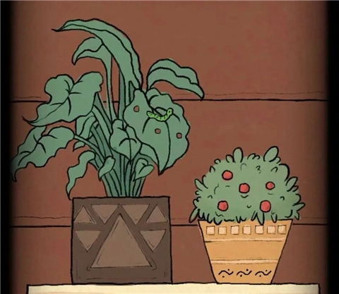 将空水壶放到水缸中,得到装满水的喷壶,用喷壶点击左侧盆栽会得到青虫,将青虫重新放入水缸得到破损名片,并换回原位置。