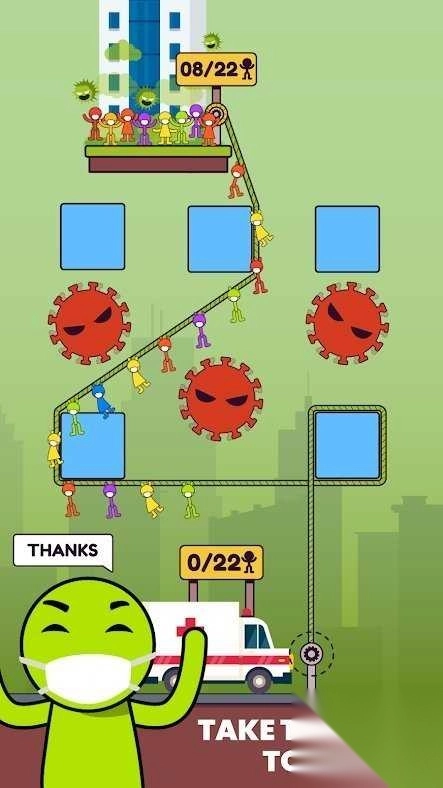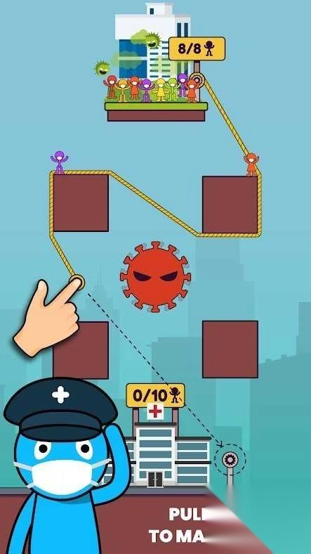 《病毒攻击:绳索救人》是一款巧妙融合策略与益智元素的休闲救援游戏。玩家在游戏里将化身为抗疫英雄,深入病毒肆虐的大楼展开紧张刺激的营救行动。当面对疯狂蔓延的新型病毒时,你要凭借连接绳索的方式,灵活且巧妙地绕过重重障碍物,成功把被困的人类从病毒区域解救出来,然后送往救护车。这款游戏结合了物理连线玩法与危机躲避机制,随着关卡逐步推进,还会出现巨型病毒带来更大的威胁。