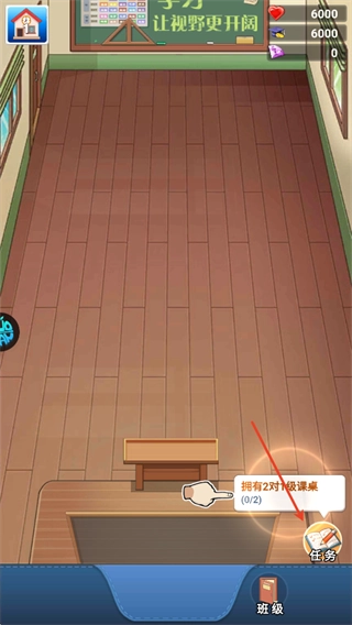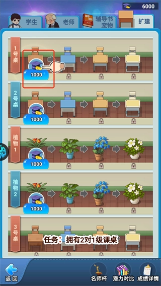 1. 踏入游戏场景,初始界面展现出教室环境,画面右下角的任务按钮不停闪烁。于班级界面浏览各类养成线,寻得1号桌的养成项目,耗费1000资源点击升级,以此推动“拥有2对1级课桌”这一任务的进度。