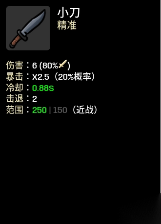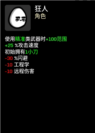 1、使用精准类武器时+100范围,+25%攻击速度,初始拥有1小刀,-30%闪避,-10工程学,-10远程伤害。