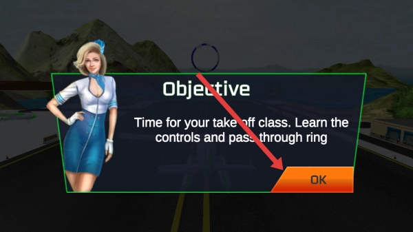 2. 在任务提示页面,点击标有橙色“OK”字样的按钮,接受操控学习,并完成穿过环形标记的起飞教学任务。