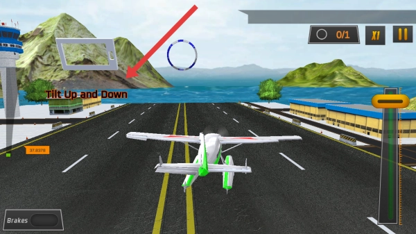3、依据画面的提示Tilt Up and Down,学习操控飞机倾斜,尝试穿过空中环形标记,完成教学关卡。