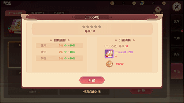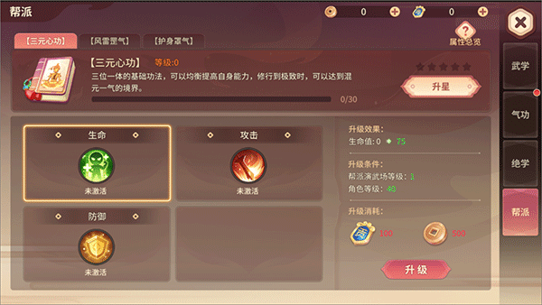最后,让我们瞧瞧“帮派武学”。其包含三重心法,分别为“三元心功”、“风雷罡气”以及“护体罩气”。每种心法与不同的角色属性相对应。侠士们加入帮派后,能够借助帮派贡献与铜钱来对心法进行升级。伴随着心法等级的提高,侠士们的角色属性也会得到相应的增强。
