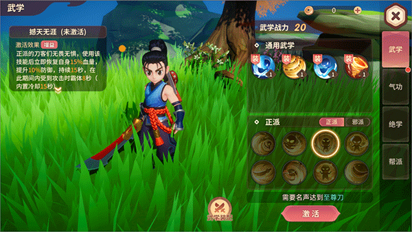 闯荡江湖,自然得掌握些门派基本功。“武学”是每位职业侠士踏入游戏后所获取的人物基础技能,提升武学技能,能在战斗中具备更强的杀伤力。而且角色完成转职后,可学习更高级技能,正派与邪派分别设有不同的技能分支供选择。随着新的转职武功习得,玩家角色的职业定位也会相应改变。侠士们能够自由组合技能,战斗时也会更加简便灵活。