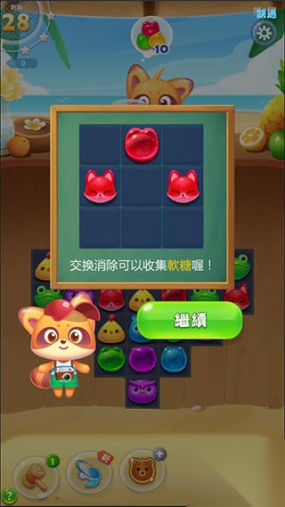 1当正式踏入关卡,游戏会给予我们一些小提示,通过交换消除的方式能够收集软糖,而这些软糖便是本关所需收集的目标。