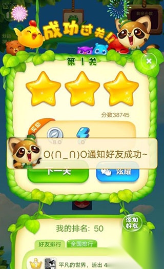 6、当我们在限定的步骤内收集完成后,就获得了本关游戏的胜利,这时候会弹出小鸡和小浣熊它们开心的合影。